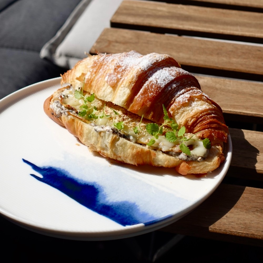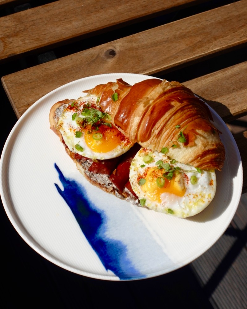 Яйця з салатом та хрустким шматочком хліба та мисливська ковбаска
