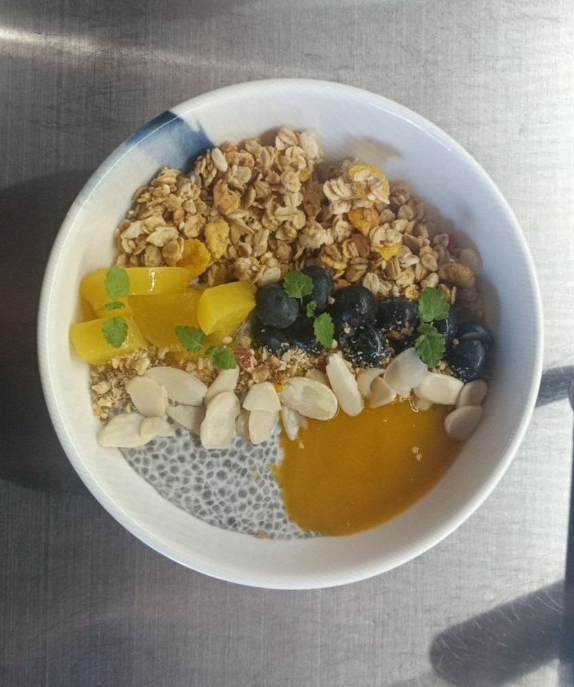 Кокосовий пудінг чіа з гранолою та манговим кулі